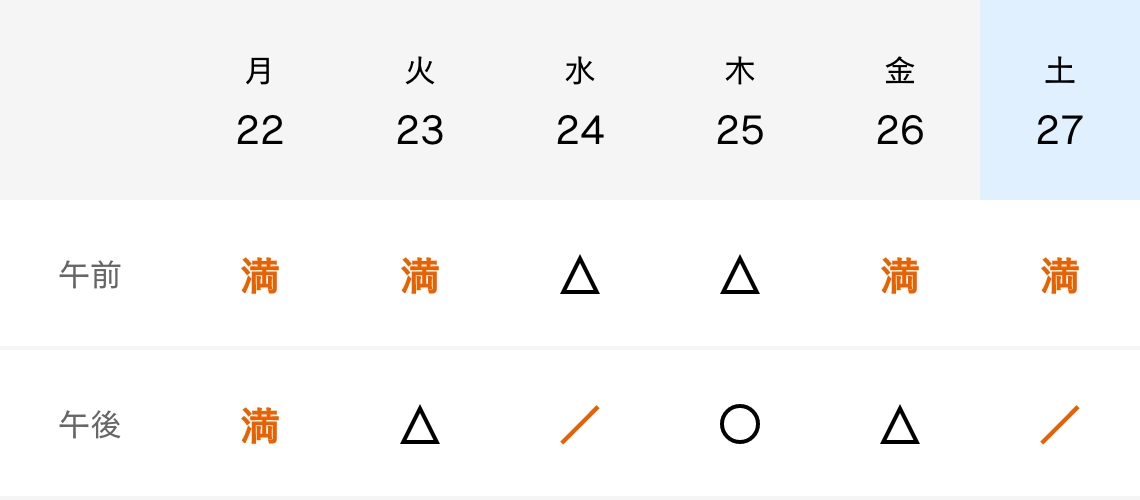 下記ご予約状況をご確認のうえ、お電話にてご予約をお願いいたします。