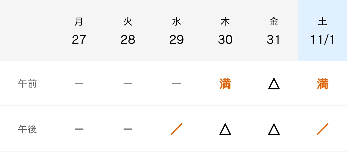 2025年10月30日〜11月8日のご予約状況 (10月30日現在)