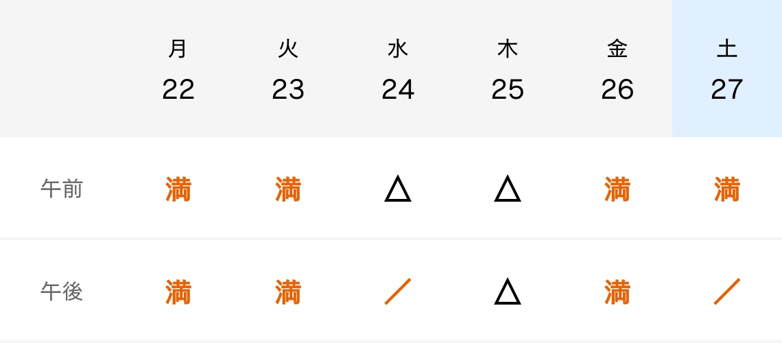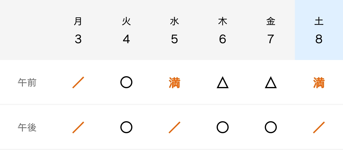 下記ご予約状況をご確認のうえ、お電話にてご予約をお願いいたします。