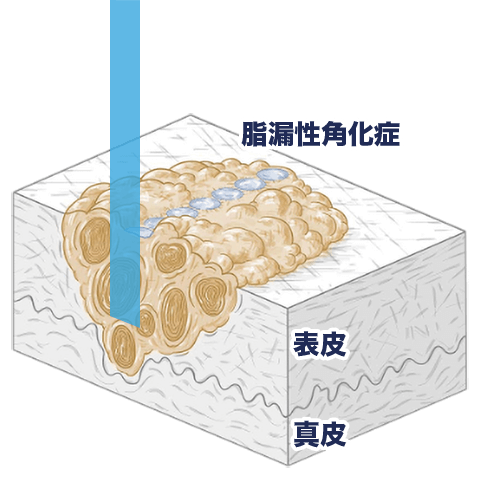 ブルーレーザーをニキビに照射することにより、ニキビ内にあるポルフィリンを分解して活性酸素を発生させます。この活性酸素がニキビを悪化させる原因菌であるアクネ菌を殺菌し、その結果、難治性のニキビを改善させます。